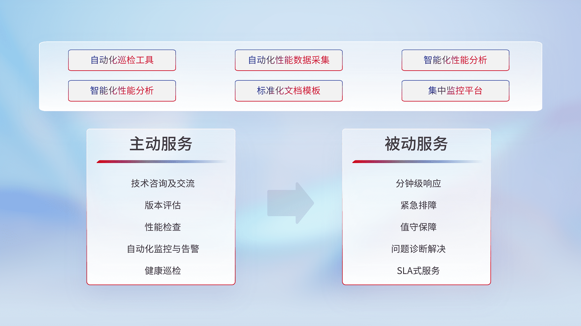 智能化工具和标准化文档,,,保障服务质量,,提供主动服务(包含技术咨询、、版本评估、、、性能检查、、自动化监控与告警、、、健康巡检)和被动服务包含(分钟级响应、、、、紧急排障、、值守保障、、问题诊断解决、、、、SLA服务)。。